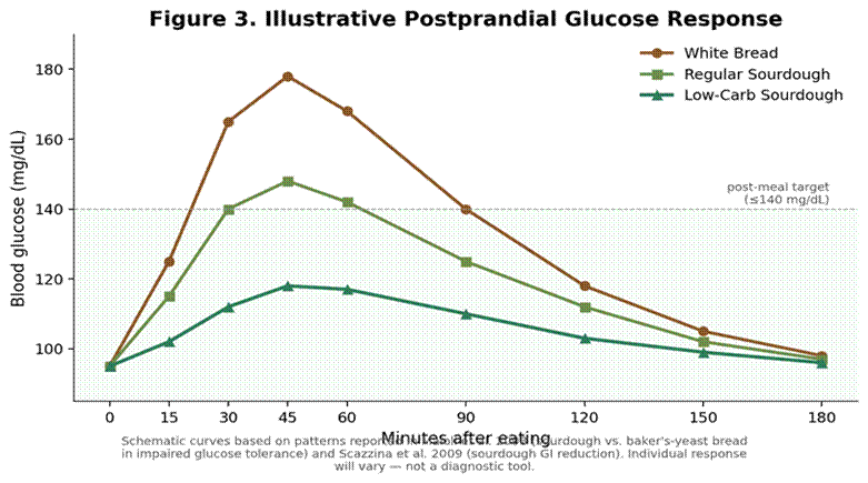 Figure 3 visualizes the clinical pattern from Maioli (2008) and Scazzina (2009) applied to the three bread types. White bread produces a sharp spike often crossing the post-meal target line. Traditional sourdough tracks similarly in shape but with a meaningfully lower peak. A low-carb sourdough bread barely lifts off baseline because there is so little available starch for the amylase to work on. For someone monitoring continuous glucose data, this is the difference between a 60-point excursion and a 20-point ripple.