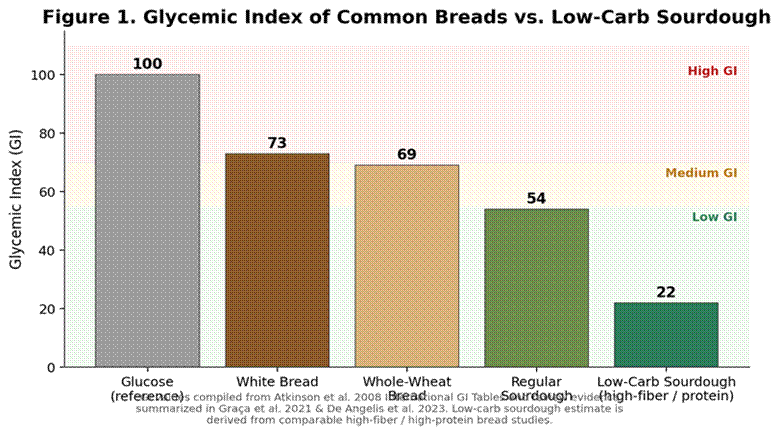 Figure 1 summarizes GI values that have been measured repeatedly in the peer-reviewed literature. Glucose is the reference at 100. White bread lands in the low-70s. Traditional sourdough, depending on flour and fermentation time, falls in the mid-50s — officially “low GI.” A properly engineered low-carb sourdough bread, with most of the refined starch replaced by high-fiber wheat flour and wheat protein, drops further into the low-20s range, because there is simply less available starch to digest in the first place.