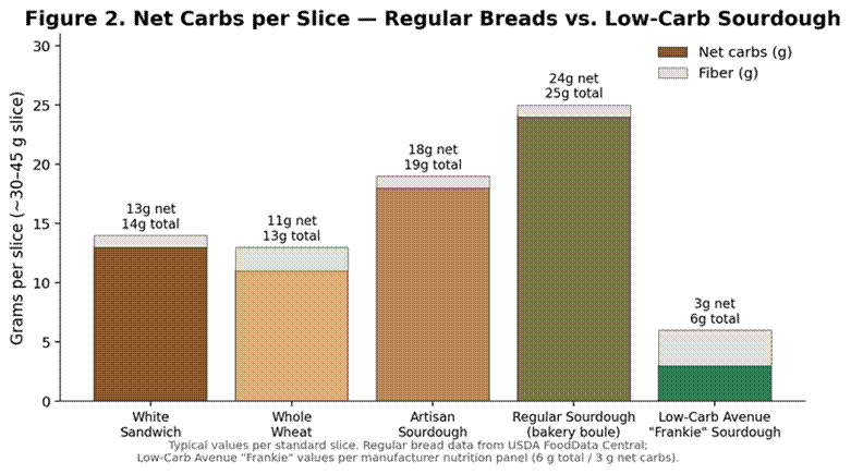 Figure 2 lines this up visually. The low-carb sourdough bread delivers roughly one-eighth of the carbohydrate of a bakery boule, while preserving the crust, the crumb, and the tang. That is the mechanical reason a product like Frankie can fit into diets that have been closed to bread for years.